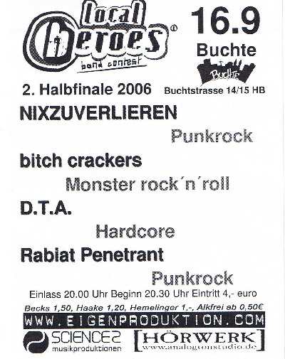 BANDINFO ..."das ist penetrant, RABIAT PENETRANT!" ...so entstand bei der Tonaufnahme dieser liebevolle Bandname, als das gemeinsame Musikvideo "Es ist Krieg" erstellt wurde und das Kind einen Namen brauchte. Rabiat Penetrant aus Bremen rocken nun schon seit 1996 in klassischer Besetzung: Matze (Stromgitarre, Gesang, Baujahr 1979) Martin (Barfuß-Schlagzeug, Gebrüll, Baujahr 1977) Kai „Bulli“ (Strombass, stumm, Baujahr 1976) Das aus einem Biologen, einem Fast-Sozialpädagogen und einem überqualifizierten Beinahe-Erzieher zusammengesetzte Trio steht im wahren Leben leidenschaftlich gern auf der Bühne und beschallt das Publikum mit abwechslungsreichem Punkrock mit Einflüssen aus Metal, Hardcore und auch etwas Ska und Reggae. Druckvoll vorgetragen, teilweise mit abwechselndem Gesang, handeln die überwiegend deutschsprachigen Stücke von den Dingen des Lebens, von Gewalt und Liebe, Mensch und Tier, Politik und Gesellschaft…sowie von geschlechtsspezifischen Hygieneproblemen („Eijajuggen“). Neben geradlinigen Kopfnicker-Pogo-Stücken und zum Mitsingen animierenden Ohrwürmern umfasst das Programm damit auch experimentelle Jazz-Core-Passagen, ich-muss-die-ganze-Zeit-hüpfen-Offbeats, hammerharte Metal-Riffs und sogar einige Schmuse-Punksongs. Unter Umständen gerät das Publikum dabei in eine „geradezu bayernzeltartige Hochstimmung“ (Weser-Kurier über die Zugabe „Stasi ist ´ne Frau“). Häufig wird das eigene Programm auch von bekannten Coversongs untermalt. Bühnen-Highlights waren die alljährlichen Weihnachtskonzerte im KUZ Osterholz, Auftritte mit Dritte Wahl, Rantanplan, Graue Zellen, Circus of Hate und vielen weiteren netten Bands in Freizis, Wagenburgen, Kneipen, Lagerhallen, LKW´s, Bauwagen und Bauernhöfen in Bremen, Niedersachsen und Umgebung. Obwohl Matze sehr lange auf Jamaika überwinterte und Bulli und Martin es auch öfter mal vorzogen, das deutsche Kaltland temporär zu verlassen, fanden Rabiat Penetrant immer wieder frisch inspiriert zusammen und feiern nun ihr 10-jähriges Bestehen. Neben uralten Videos (1996 / 97) und einem 4-Spur-Proberaum-Tape (1998 / 99) gibt es mit „Schuldig“ und „Isolation“ zwei Stücke auf CD (2001), weitere Aufnahmen stehen unmittelbar bevor...